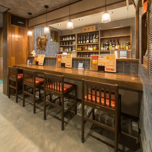 《お1人様大歓迎◎》1階のカウンター席は全4席ご用意。JR長岡京駅から徒歩1分の気軽にお越しいただけます。仕事終わりにフラッとお立ち寄り頂きやすいサク飲み利用も大歓迎◎